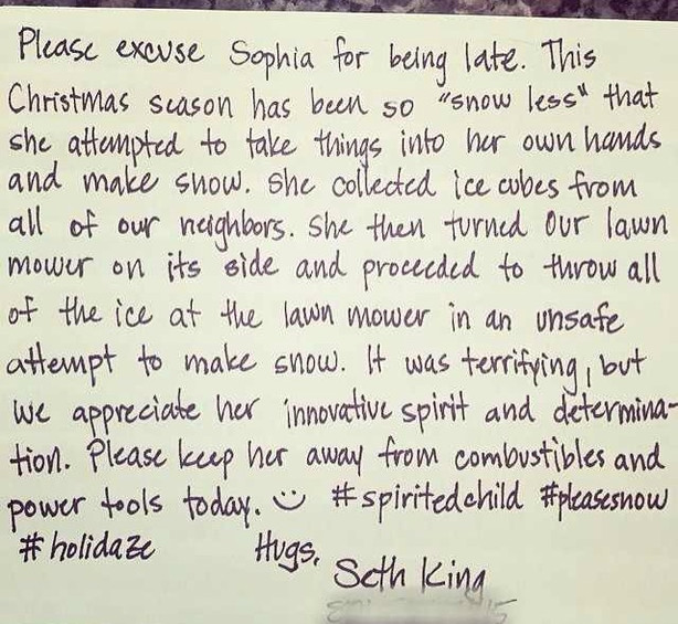 Today it is instagram.com/latenotes. A dad writes excuses for his children for being late to school, hilarity ensues. Maybe it will give your parents some inspiration? An example: